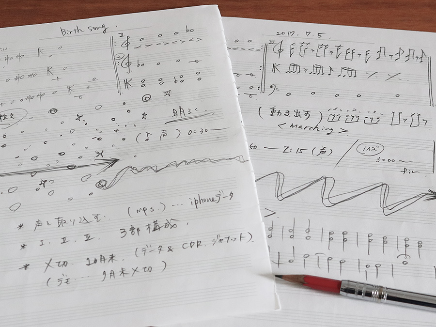 曲のイメージスケッチを起こしながら、形にしていきます。このとき、曲中へ取り込みたい音があれば、何でも取り込むことができます。